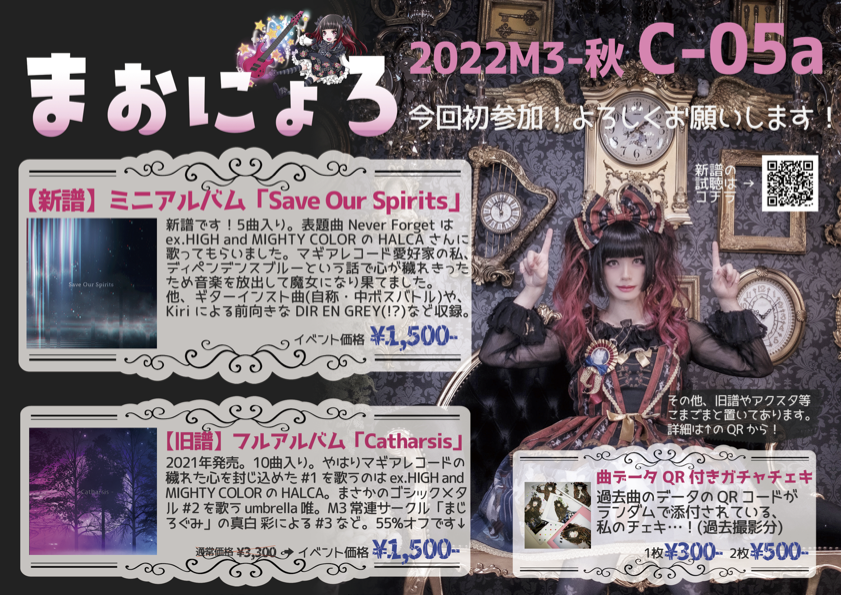 2022年10月30日(日)開催の音系・メディアミックス同人即売会 M3 に初参加し、新譜・旧譜の頒布をいたします。 スペースは C-05a 、流通センター駅を背にして左手奥側の第一展示場となります。詳細はカタログ内の図面や M3 サークルリスト の会場配置図をご覧ください。